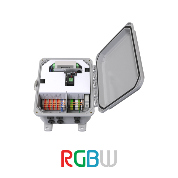 PDX-RDS4 is an exterior-rated enclosures with a hinged cover that latches and seals using a formed in place PUR gasket and a stainless steel latch. It consolidates multiple input sources into two outputs to the ColourLine Series luminaires. Data input from the RDM Color controller and AC input combine to provide output to two Starter Cords or two DMX Outputs. Splitter is fully RDM compliant.