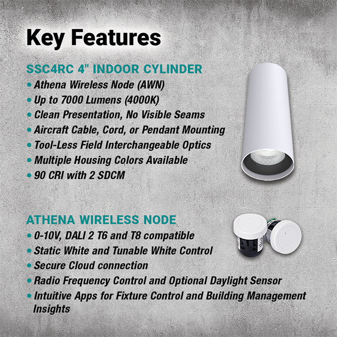 Solid State Luminaires is excited to announce our SSC4RC Four-Inch Round Interior Cylinders with Integrated Lutron Athena Wireless Control! Canopy integration of the Athena Wireless Node (AWN) enables a scalable, adaptable and streamlined wireless control system. The AWN is compatible with 0-10V dimming, and DALI 2 Type 6 and Type 8 control so any static white or tunable white luminaire can be adapted to the system.