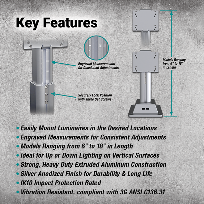 The CAA-6-8 (6" to 8"), CAA-9-13 (9" to 13"), and CAA-12-18 (12" to 18") Adjustable Cantilever Mounting Arms have engraved measurements to easily achieve the exact mounting length. The strong, heavy-duty construction ensures secure luminaire mounting with the highest level of IK10 Impact Protection, and Vibration Resistant, compliant with 3G ANSI C136.31. For reliability and long-life protection, this mounting arm is constructed of durable Silver Anodized Extruded Aluminum (SAF215, 7 Micron Thickness) with 316 Stainless Steel Hardware.
