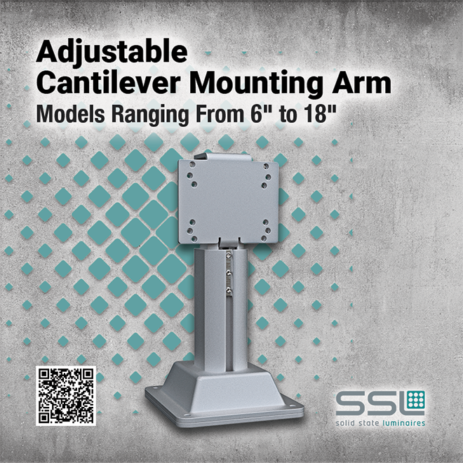 Announcing the All-New Adjustable Cantilever Mounting Arm from Solid State Luminaires. This heavy-duty, adjustable mounting arm is designed exclusively for the LZWET, LZXWET, CLZWET, CLWET, ECVLWET.15, ECVLXWET-1.5, CVLXWET-1.5, and CVLWET-1.5 product families. Now it’s easy and convenient to mount luminaires in the exact location to achieve optimal visual results! The CAA-6-8 (6" to 8"), CAA-9-